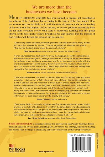 Outreach Resource of the Year Recommendation Best World Missions Book, from Byron Borger, Hearts and Minds Bookstore We are more than the businesses we have become. Much of Christian ministry has been shaped to operate not according to the witness of the Scriptures, but according to the values of the free market. We adopt metrics of success that have nothing to do with the state of people's souls or the seeding of the earth with the kingdom of God. We have borrowed our paradigms uncritically from the for-profit corporate sector. The mission of the Church is being held back by the business container into which we have placed the gospel. Every year Scott Bessenecker travels the world with thousands of college students, ministering to those in need and learning from the global church about what God is doing in the world. In Overturning Tables he shows, through stories and analysis, that the mission of God reaches well beyond the grasp of the free market, and if we are willing to reach as well, we will see God do amazing things, even as the world sees the gospel in its fullest sense.