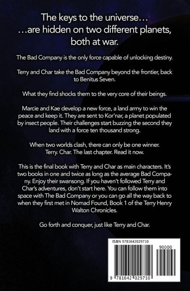 The keys to the universe... ...are hidden on two different planets, both at war. The Bad Company is the only force capable of unlocking destiny. Terry and Char take the Bad Company beyond the frontier, back to Benitus Seven. What they find shocks them to the very core of their beings. Marcie and Kae develop a new force, a land army to win the peace and keep it. They are sent to Kor'nar, a planet populated by insect people. Their challenges start buzzing the second they land with a force ten thousand strong. When two worlds clash, there can only be one winner. Terry. Char. The last chapter. Read it now. This is the final book with Terry and Char as main characters. It's two books in one and twice as long as the average Bad Company. Enjoy their swansong. If you haven't followed Terry and Char's adventures, don't start here. You can follow them into space with The Bad Company or you can go all the way back to when they first met in Nomad Found, Book 1 of the Terry Henry Walton Chronicles. Go forth and conquer, just like Terry and Char. --- PLEASE NOTE --- *NOTE: If cursing is a problem, then this might not be for you.