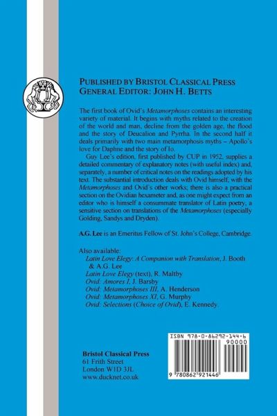 The first book of Ovid's Metamorphoses contains an interesting variety of material. It begins with myths related to the creation of the world and man, decline from the golden age, the flood and the story of Deucalion and Pyrrha. In the second half it deals primarily with two main metamorphosis myths - Apollo's love for Daphne and the story of Io. Guy Lee's edition, first published by CUP in 1952, supplies a detailed commentary of explanatory notes (with useful index) and, separately, a number of critical notes on the readings adopted by his text. the substantial introduction deals with Ovid himself, with the Metamorphoses and Ovid's other works; there is also a practical section on the Ovidian hexameter and (as one might expect from an editor who is himself a consummate translator of Latin poetry) a sensitive section on translations of the Metamorphoses, in particular Golding, Sandys and Dryden.