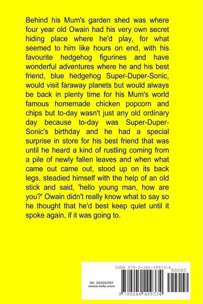 Behind his Mum's garden shed was where four year old Owain had his very own secret hiding place where he'd play, for what seemed to him like hours on end, with his favourite hedgehog figurines and have wonderful adventures where he and his best friend, blue hedgehog Super-Duper-Sonic, would visit faraway planets but would always be back in plenty time for his Mum's world famous homemade chicken popcorn and chips but to-day wasn't just any old ordinary day because to-day was Super-Duper-Sonic's birthday and he had a special surprise in store for his best friend that was until he heard a kind of rustling coming from a pile of newly fallen leaves and when what came out came out, stood up on its back legs, steadied himself with the help of an old stick, and said, 'hello young man, how are you?' Owain didn't really know what to say so he thought that he'd best keep quiet until it spoke again if it was going to.