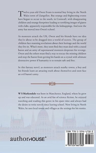 Twelve-year-old Owen Evans is normal boy living in the North Wales town of Llangollen. But strange and frightening events have begun to occur to the south, in Cornwall, with disappearing children and strange footprints leading to terrifying images of giants with clubs, apparently responsible for the kidnappings. And now the army has moved into Owen’s school. As monsters attack the United Kingdom, Owen and his friends have no idea they’re about to be dragged into a world of secrets. The group of children faces stunning revelations about their heritage and the world they live in. What’s more, they soon find they must deal with a crazed baron and an army of supernatural monsters desperate for revenge. Owen and the others must find a way to rescue the missing children and stop the baron from getting his hands on a crystal with ultimate destructive power if humanity is to remain safe and free. In this fantasy novel, as monsters attack nearby towns, a boy and his friends learn an amazing truth about themselves and soon face an evil baron’s army.