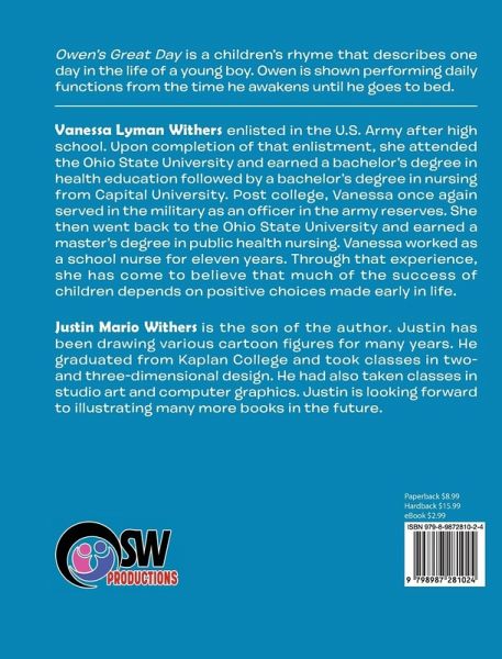 Owen's Great Day is a children's rhyme that describes one day in the life of a young boy. Owen is shown performing daily functions from the time he awakens until he goes to bed. Vanessa Lyman Withers enlisted in the U.S Army after high school. Upon completion of that enlistment, she attended the Ohio State University and earned a bachelor's degree in health education followed by a bachelor's degree in nursing from Capital University. Post college, Vanessa once again served in the military as an officer in the army reserves. She then went back to the Ohio State University and earned a master's degree in public health nursing. Vanessa worked as a school nurse for eleven years. Through that experience, she has come to believe that much of the success of children depends on positive choices made early in life. Justin Mario Withers is the son of the author. Justin has been drawing various cartoon figures for many years. He graduated from Kaplan College and took classes in two-and three-dimensional design. He had also taken classes in studio art and computer graphics. Justin is looking forward to illustrating many more books in the future.