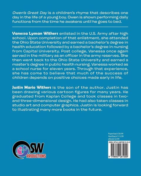 Owen's Great Day is a children's rhyme that describes one day in the life of a young boy. Owen is shown performing daily functions from the time he awakens until he goes to bed. Vanessa Lyman Withers enlisted in the U.S Army after high school. Upon completion of that enlistment, she attended the Ohio State University and earned a bachelor's degree in health education followed by a bachelor's degree in nursing from Capital University. Post college, Vanessa once again served in the military as an officer in the army reserves. She then went back to the Ohio State University and earned a master's degree in public health nursing. Vanessa worked as a school nurse for eleven years. Through that experience, she has come to believe that much of the success of children depends on positive choices made early in life. Justin Mario Withers is the son of the author. Justin has been drawing various cartoon figures for many years. He graduated from Kaplan College and took classes in two-and three-dimensional design. He had also taken classes in studio art and computer graphics. Justin is looking forward to illustrating many more books in the future.