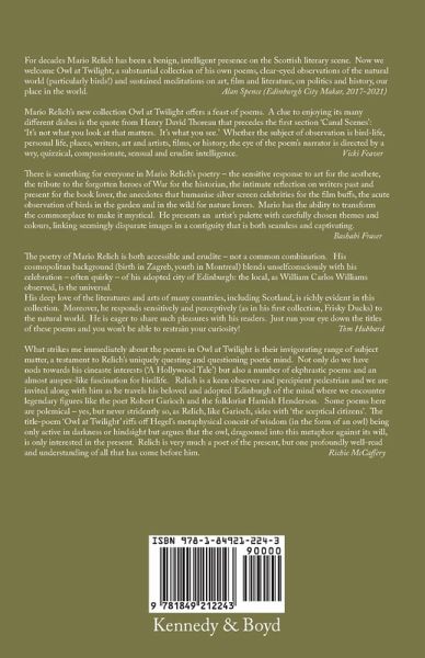 'For decades Mario Relich has been a benign, intelligent presence on the Scottish literary scene. Now we welcome Owl at Twilight, a substantial collection of his own poems, clear-eyed observations of the natural world (particularly birds!) and sustained meditations on art, film and literature, on politics and history, our place in the world.' Alan Spence (Edinburgh City Makar, 2017-2021).