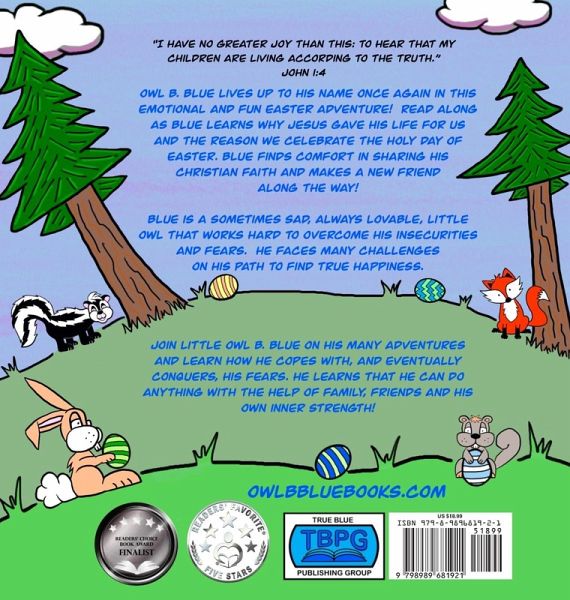 "I have no greater joy than this: to hear that my children are living according to the truth." John 1:4 Little Owl B. Blue wakes up on Easter morning and instead of being glad, he is a little bit sad. He heard in church that Jesus had died and does not feel much like celebrating or looking for colored eggs. However, after Blue's parents explain the Resurrection to him, he is overcome with joy and runs out to share the good news with the world! OBB lives up to his name once again in this emotional and fun Easter adventure! Read along as Blue learns why Jesus gave His life for us and the reason we celebrate the holy day of Easter. Blue finds comfort in sharing his Christian faith and makes a new friend along the way! Blue is a sometimes sad, always lovable, little owl that works hard to overcome his insecurities and fears. He faces many challenges on his path to find true happiness. Join little Owl B. Blue on his many adventures and learn how he copes with, and eventually conquers, his fears. He learns that he can do anything with the help of family, friends and his own inner strength! This is the third book in the Owl B. Blue Adventure series with much more rhyming fun to come! Always remember...WHOOO LOVES YOU?! BLUE, THAT'S WHOOO!!!