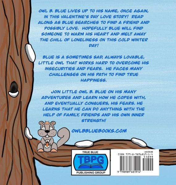 "Rare as is true love, true friendship is rarer." JEAN DE LA FONTAINE On a snowy day in February, lonely Owl B. Blue is trying to summon up the courage to find that rare and elusive thing in all the world... A BEST FRIEND! And WHOOO knows what else that could lead to?!! OBB lives up to his name once again in this Valentine's Day love story! Read along as Blue searches to find a friend, and possibly more than that. Hopefull, Blue will find someone to warm his heart and melt away the chill of loneliness on this cold winter day! Blue is a sometimes sad, always lovable, little owl that works hard to overcome his insecurities and fears. He faces many challenges on his path to find true happiness. Join little Owl B. Blue on his many adventures and learn how he copes with, and eventually conquers, his fears. He learns that he can do anything with the help of family, friends and his own inner strength! This is the second book in the Owl B. Blue Adventure series with much more rhyming fun to come! Always remember...WHOOO LOVES YOU?! BLUE, THAT'S WHOOO!!!