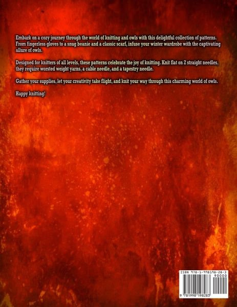 Within these pages, you'll discover a delightful collection of knitting patterns that blend the warmth of traditional knitwear with the whimsy of our feathered friends, the owls. Whether you're a seasoned knitter or recently conquered the fundamentals along your crafting journey, this book offers something special for everyone. This trio of patterns infuses charm and personality into your winter wardrobe essentials: fingerless gloves, a snug beanie, and a classic scarf, each adorned with the captivating allure of owls. These designs are more than just garments; they're a celebration of the artistry and joy that knitting brings into our lives. As you embark on your knitting adventure, immerse yourself in the rhythmic dance of stitches, and watch as these whimsical owls come to life, stitch by stitch. The 3 patterns are all knit flat on 2 straight needles. To make this delightful collection, you'll need your colour choices of worsted weight yarns, a cable needle and a tapestry needle. You can use whatever you like for eyes: small flat jewels, small buttons or even embroider on the eyes. So gather your needles, your selected yarn, and let your creativity take flight as you embark on this cozy journey through the world of knitting and owls. Happy knitting everyone!