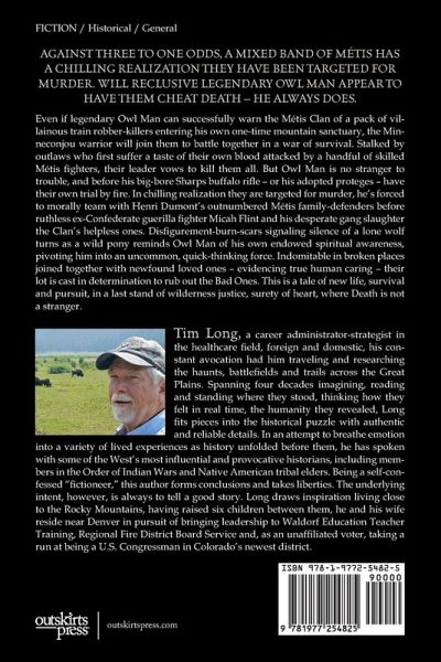 Even if legendary Owl Man can successfully warn the Métis Clan of a pack of villainous train robber-killers entering his own one-time mountain sanctuary, the Minneconjou warrior will join them to battle together in a war of survival. Stalked by outlaws who first suffer a taste of their own blood attacked by a handful of skilled Métis fighters, their leader vows to kill them all. But Owl Man is no stranger to trouble, and before his big-bore Sharps buffalo rifle - or his adopted proteges - have their own trial by fire. In chilling realization they are targeted for murder, he's forced to morally team with Henri Dumont's outnumbered Métis family-defenders before ruthless ex-Confederate guerilla fighter Micah Flint and his desperate gang slaughter the Clan's helpless ones. Disfigurement-burn-scars signaling silence of a lone wolf turns as a wild pony reminds Owl Man of his own endowed spiritual awareness, pivoting him into an uncommon, quick-thinking force. Indomitable in broken places joined together with newfound loved ones - evidencing true human caring - their lot is cast in determination to rub out the Bad Ones. This is a tale of new life, survival and pursuit, in a last stand of wilderness justice, surety of heart, where Death is not a stranger.