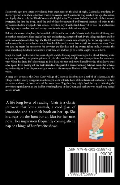 Six months ago, two sisters were chased from their home in the dead of night. Claimed as murdered by the very person who their father had trusted to oversee their Court until they reached the age of nineteen and legally able to rule the Wind Court as the High Ladies. The sisters fled with the help of their trusted protector, the Fire Fae Souji, until the end of their bloodstained and battered journey led them to the mysterious shadow wrapped Dusk Court. Here they stayed as the land dissolved to war, Fae and humans alike fighting across borders, and strange new foes rising out of the winter nights. Belima, the second daughter, the beautiful half fae with her mother's looks and a love for all finery, sees more than most know. She's tired of the pain and suffering, exprenced both by the village residents and her own close companions. She begs the Dusk Court healer Dafnea into accepting her as her apprentice, but it devastated her to learn that no matter how hard she works, some lives are still lost no matter what. Then one day, she meets the mysterious Fae boy with the blue hair and the twisted feline smile. He wants the keys, something she doesn't even know what they are, and will go to terrible lengths to seek them. Souji, the loyal Fire Fae with the heart of gold and the flaming magic burning in his blood. His lazy smile is gone, replaced by the granite grimace of pain that renders his right arm damaged from his encounter with Water Fae Iron. He's determined to beat back his pain and prove himself worthy of his lady's trust once again. Even beating off the dark strands of the past if it means winning Belima's heart. But when a mysterious figure from his past emerges, not even his strongest illusions will be able to mask the scars he wears. A steep cost comes as the Dusk Court village of Glennoak dissolves into a hotbed of sickness, and the village children slowly disappear into the night air. It will take both of these fractured souls down to their very core and test the bonds of truth between them. Together they might hold the key to defeating the mysterious spirit known as the Earlkin wreaking havoc in the Court, and perhaps even reveal long buried secrets as well.