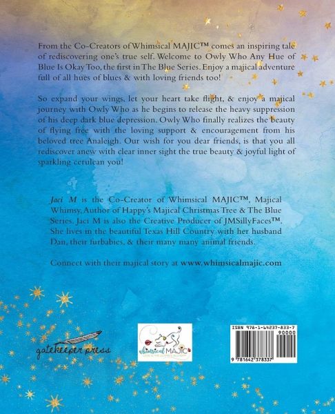 From the Co-Creators of Whimsical MAJIC(TM)¿ comes an inspiring tale of rediscovering one's true self. Welcome to Owly Who Any Hue of Blue Is Okay Too, the first in The Blue Series. Enjoy a majical adventure full of all hues of blues & with loving friends too! So expand your wings, let your heart take flight, & enjoy a majical journey with Owly Who as he begins to release the heavy suppression of his deep dark blue depression. Owly Who finally realizes the beauty of flying free with the loving support & encouragement from his beloved tree Analeigh. Our wish for you dear friends, is that you all rediscover anew with clear inner sight the true beauty & joyful light of sparkling cerulean you!