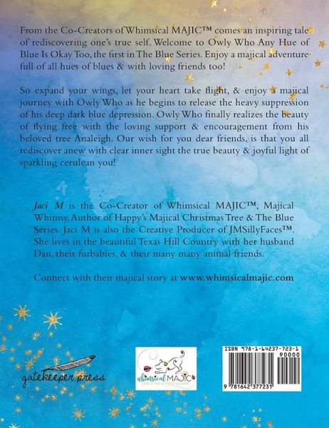 From the Co-Creators of Whimsical MAJIC(TM)¿ comes an inspiring tale of rediscovering one's true self. Welcome to Owly Who Any Hue of Blue Is Okay Too, the first in The Blue Series. Enjoy a majical adventure full of all hues of blues & with loving friends too! So expand your wings, let your heart take flight, & enjoy a majical journey with Owly Who as he begins to release the heavy suppression of his deep dark blue depression. Owly Who finally realizes the beauty of flying free with the loving support & encouragement from his beloved tree Analeigh. Our wish for you dear friends, is that you all rediscover anew with clear inner sight the true beauty & joyful light of sparkling cerulean you!