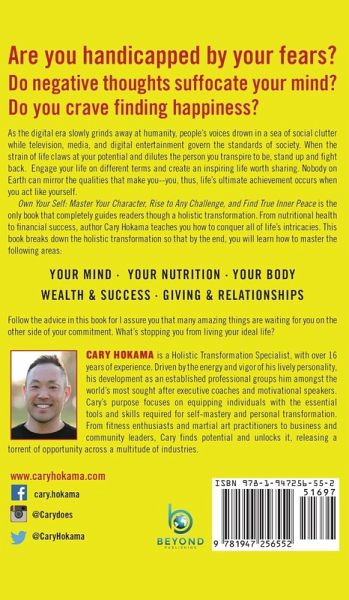 When the strain of life claws at your potential and dilutes the person you transpire to be, stand up and fight back. Engage your life on different terms and create an inspiring life worth sharing. Nobody on Earth can mirror the qualities that make you--you, thus, life's ultimate achievement occurs when you act like yourself. Own Your Self: Master Your Character, Rise to Any Challenge, and Find True Inner Peace is the only book that completely guides readers though a holistic transformation. From nutritional health to financial success, author Cary Hokama teaches you how to conquer all of life's intricacies. This book breaks down the holistic transformation so that by the end, you will learn how to master the following areas: 1. YOUR MIND 2. YOUR NUTRITION 3. YOUR BODY 4. WEALTH & SUCCESS 5. GIVING & RELATIONSHIPS Follow the advice in this book for I assure you that many amazing things are waiting for you on the other side of your commitment. What's stopping you from living your ideal life? Pick up your copy today by clicking the orange BUY NOW button at the top of this page!