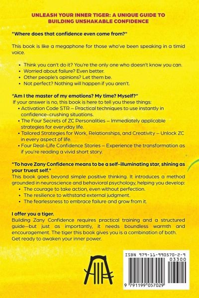 Unleash Your Inner Tiger: A Unique Guide to Building Unshakable Confidence ¿"Where does that confidence even come from?" This book is like a megaphone for those who've been speaking in a timid voice.Think you can't do it? You're the only one who doesn't know you can. Worried about failure? Even better. Other people's opinions? Let them be. You have to be perfect? Nothing scary is going to happen. ¿"Am I the master of my emotions? My time? Myself?" If your answer is no, this book is here to tell you these things:Activation Code STR - Practical techniques to use instantly in confidence-crushing situations. The Four Secrets of ZC Personalities - Immediately applicable strategies for everyday life. Tailored Strategies for Work, Relationships, and Creativity - Unlock ZC in every aspect of life. Four Real-Life Confidence Stories - Experience the transformation as if you're reading a vivid short story. ¿"To have Zany Confidence means to be a self-illuminating star, shining as your truest self." This book goes beyond simple positive thinking. It introduces a method grounded in neuroscience and behavioral psychology, helping you develop:The courage to take action, even without perfection. The resilience to withstand external judgment. The fearlessness to embrace failure and grow from it. ¿I offer you a tiger. Building Zany Confidence requires practical training and a structured guide-but just as importantly, it needs boundless warmth and encouragement. The tiger this book gives you is a combination of both. Get ready to awaken your inner power. "Even the most fragile-looking person has a tiger inside them. It's just asleep. Or maybe it only thinks it's small and weak, fooled by false beliefs. Of course, awakening the tiger doesn't happen automatically. But it's not impossible either. Just do it honestly, one step at a time. Lift your head and look at the sky. Press your toes into the ground. Strengthen your legs, one by one. Stand up. Walk forward. And then-run. Imagine yourself running like a tiger, the wind against your face, the world opening up before you. That's how it happens." -From the book-