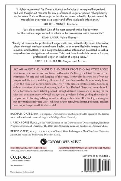 The Owner's Manual to the Voice demystifies the voice, enabling singers and all voice professionals - whether actors, broadcasters, teachers, preachers, lawyers, public speakers- to communicate intelligently with physicians and understand dangers, treatments, vocal hygiene and medical procedures.