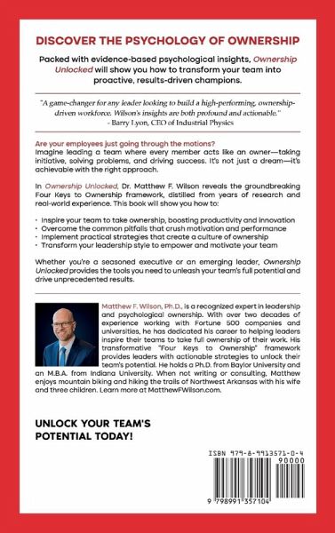 Tired of Disengaged Employees? Discover the psychology of ownership. Ownership Unlocked: 4 Principles to Build Self-Driven Teams That Take Initiative, Innovate, and Win, gives you a proven framework to transform uninspired teams into passionate "owners" who take initiative and deliver extraordinary results-without micromanaging or burning out. Fortune 500 veteran and PhD researcher Dr. Matthew F. Wilson reveals the secrets behind psychological ownership-the invisible force that motivates people to treat the business like their own. Drawing on 20 years of leadership experience and groundbreaking research, Dr. Wilson presents The Four Keys to Ownership, a straightforward system for building a high-performance culture where everyone steps up, solves problems, and stays committed for the long haul. Inside This Book, You'll Discover:The Psychology of Ownership - Activate hidden psychological triggers that drive a sense of ownership-without pricey equity giveaways so that you can retain top performers. The Four Keys Framework - A practical blueprint to reshape how your team thinks and behaves each day, so you can see immediate boosts in productivity and morale. Effective Strategies That Stick - From step-by-step implementation plans to ready-to-use conversation scripts use can use to keep employees accountable without constant hand-holding. Real-World Case Studies & Pitfall Warnings - Successes and missteps from Fortune 500 companies, so you can avoid costly mistakes and fast-track your team's success. "A game-changer for leaders looking to build a high-performing, ownership-driven workforce." - Barry Lyon, CEO of Industrial Physics Whether you're a seasoned executive or a rising leader, Ownership Unlocked delivers actionable insights, easy-to-implement exercises, and powerful leadership tools to help you cultivate a team of self-driven champions who consistently go above and beyond.