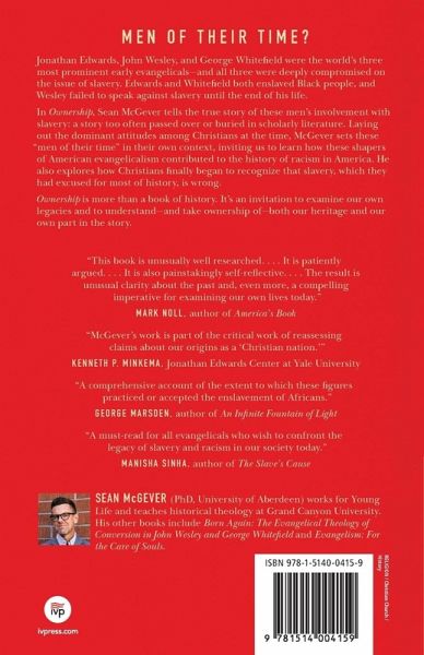 Men of their time? Jonathan Edwards, John Wesley, and George Whitefield were the three most prominent early evangelicals--and all three were deeply compromised on the issue of slavery. Edwards and Whitefield both kept slaves themselves, and Wesley failed to speak out against slavery until near the end of his life. In Ownership, Sean McGever tells the true story of these men's relationships to slavery: a story that has too often been passed over or buried in scholarly literature. Laying out the dominant attitudes among Christians toward slavery at the time, McGever sets these "men of their times" in their own context, inviting us to learn how these shapers of American evangelicalism contributed to the tragic history of racism in America. He also explores how Christians finally began to recognize that slavery, which they'd excused for most of Christian history, is actually wrong. It's a story that white evangelicals must wrestle with today. Ownership is more than a book of history. It's an invitation to examine our own legacies and to understand--and take ownership of--both our heritage and our own part in the story.