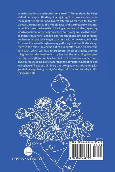 In an inspirational and motivational read, T. Renee shows how she shifted her ways of thinking. Sharing insight on how she overcame the loss of her mother and divorce after being married for twenty-six years, relocating to the Middle East, and starting a new chapter in her life. How the benefits of having a positive mindset, speaking words of affirmation, relying on prayer, and having crazy faith in times of trials, tribulations, and life-altering situations saw her through. Implementing the tools to get back on track, do the work, and heal. To realize that even though we may go through a storm, God is always there in the midst. Taking us out of our comfort zone, to clear the very path, which will lead to greatness. To accept reality and the thing that was destined to destroy her was the very thing that gave her the strength to find her true self. To live and walk in her God-given purpose. Being a little wiser than the day before, accepting and loving herself flaws and all. Every day taking no one and anything for granted, always being thankful and grateful for another day in this thing called life.