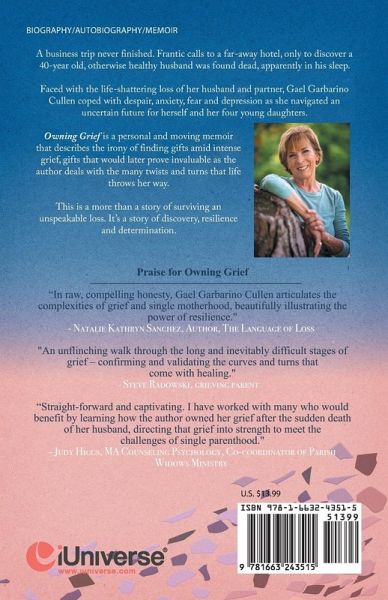Praise for Owning Grief In raw, compelling honesty, Gael Garbarino Cullen articulates the complexities of grief and single motherhood, beautifully illustrating the power of resilience. Natalie Kathryn Sanchez, Author, The Language of Loss An unflinching walk through the long and inevitably difficult stages of grief - confirming and validating the curves and turns that come with healing. Steve Radowski, grieving parent Straight-forward and captivating. I have worked with many who would benefit by learning how the author owned her grief after the sudden death of her husband, and then directed that grief into strength to meet the challenges of single parenthood. Judy Higgs, MA Counseling Psychology, Co-coordinator of Parish Widows Ministry