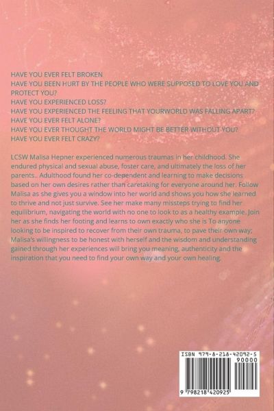 HAVE YOU EVER FELT BROKEN ¿¿¿HAVE YOU BEEN HURT BY THE PEOPLE WHO WERE SUPPOSED TO LOVE YOU AND PROTECT YOU? HAVE YOU EXPERIENCED LOSS? HAVE YOU EXPERIENCED THE FEELINGTHAT YOURWORLD WAS FALLING APART? HAVE YOU EVER FELT ALONE? HAVE YOU EVER THOUGHT THE WORLD MIGHT BE BETTER WITHOUT YOU? HAVE YOU EVER FELT CRAZY? LCSW Malisa Hepner experienced numerous traumas in her childhood. She endured physical and sexual abuse, foster care, and ultimately the loss of her parents.. Adulthood found her co-dependent and learning to make decisions based on her own desires rather than caretaking for everyone around her. Follow Malisa as she gives you a window into her world and shows you how she learned to thrive and not just survive. See her make many missteps trying to find her equilibrium, navigating the world with no one to look to as a healthy example. Join her as she finds her footing and learns to own exactly who she is To anyone looking to be inspired to recover from their own trauma, to pave their own way; Malisa's willingness to be honest with herself and the wisdom and understanding gained through her experiences will bring you meaning, authenticity and the inspiration that you need to find your own way and your own healing.