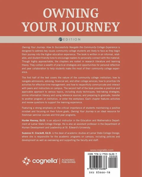 Owning Your Journey: How to Successfully Navigate the Community College Experience is designed to address key issues community college students are likely to face as they begin their journey into the higher education experience. The book is written in an informal, relatable, and student-friendly tone to encourage readers to personally connect with the material. Though highly approachable, the chapters are rooted in research literature and learning theory. They contain a wealth of practical strategies and opportunities for personal reflection and peer collaboration to help students make the most of their community college experience. The first half of the text covers the nature of the community college institution; how to navigate admissions, advising, financial aid, and other college services; how to prioritize life activities for effective time management; and how to respectfully communicate and interact with peers and instructors on campus. The second half of the book provides a practical and applicable approach to various topics, including study techniques; test-taking strategies; online information literacy and using reference sources; and preparing to graduate, transfer to another program or institution, or enter the workplace. Each chapter features activities and review questions to support the learning experience. Featuring a strong emphasis on the critical importance of students maintaining a positive mindset and focusing on their future goals, Owning Your Journey is an ideal resource for freshman seminar courses and first-year programs.