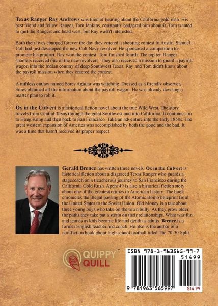 Texas Ranger Ray Andrews was tired of hearing about the California gold rush. His best friend and fellow Ranger, Tom Jenkins, constantly badgered him about it. Tom wanted to quit the Rangers and head west, but Ray wasn't interested. Both their lives changed forever the day they entered a shooting contest in Austin. Samuel Colt had just developed the new Colt Navy revolver. He sponsored a competition to promote his product. Ray won the contest. Tom finished fourth. The top ten Ranger shooters received one of the new revolvers. They also received a mission to guard a payroll wagon into the Indian country of deep Southwest Texas. Ray and Tom didn't know about the payroll mission when they entered the contest. A ruthless outlaw named Sores Aguilar was watching. Dressed as a friendly observer, Sores obtained all the information about the payroll wagon. He was already devising a master plan to rob it. Ox in the Culvert is a historical fiction novel about the true Wild West. The story travels from Central Texas through the great Southwest and into California. It continues on to Hong Kong and then back to San Francisco. Take an adventure into the early 1850s. The great western expansion of America was accomplished by both the good and the bad. It was a time that hasn't received its proper respect.
