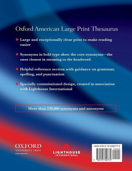 Authoritative, up-to-date, and with exceptionally clear print, theOxford American Large Print Thesaurus contains more than 130,000 synonyms and antonyms, drawing on the most recent findings of the language research program at Oxford University Press. The book's clear page layout, designed in association with Lighthouse International, offers enlarged fonts, larger margins, generous linespacing, and good quality paper, ensuring that there is a minimum glare and show-through. Ideal for both adults and children, particularly those with vision impairment, the Oxford American Large Print Thesaurus is a valuable reference tool for use at home, at school, or at the office. The book is also a perfect companion to the Oxford American Large Print Dictionary All Oxford American dictionaries use an easy-to-use respelling system to show how entries are pronounced. It uses simple, familiar markings to represent common American English sounds.