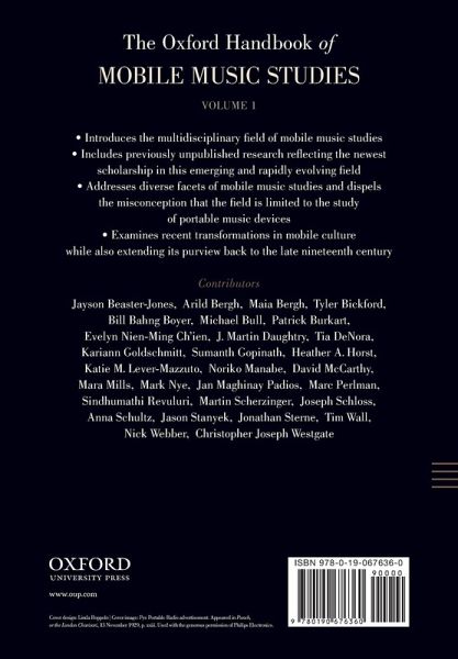 The two volumes of The Oxford Handbook of Mobile Music Studies consolidate an area of scholarly inquiry that addresses how mechanical, electrical, and digital technologies and their corresponding economies of scale have rendered music and sound increasingly mobile-portable, fungible, and ubiquitous. At once a marketing term, a common mode of everyday-life performance, and an instigator of experimental aesthetics, "mobile music" opens up a space for studying the momentous transformations in the production, distribution, consumption, and experience of music and sound that took place between the late nineteenth and the early twenty-first centuries. Taken together, the two volumes cover a large swath of the world-the US, the UK, Japan, Brazil, Germany, Turkey, Mexico, France, China, Jamaica, Iraq, the Philippines, India, Sweden-and a similarly broad array of the musical and nonmusical sounds suffusing the soundscapes of mobility. Volume 1 provides an introduction to the study of mobile music through the examination of its devices, markets, and theories. Conceptualizing a long history of mobile music extending from the late nineteenth century to the present, the volume focuses on the conjunction of human mobility and forms of sound production and reproduction. The volume's chapters investigate the MP3, copyright law and digital downloading, music and cloud computing, the iPod, the transistor radio, the automated call center, sound and text messaging, the mobile phone, the militarization of iPod usage, the cochlear implant, the portable sound recorder, listening practices of schoolchildren and teenagers, the ringtone, mobile music in the urban soundscape, the boombox, mobile music marketing in Mexico and Brazil, music piracy in India, and online radio in Japan and the US.