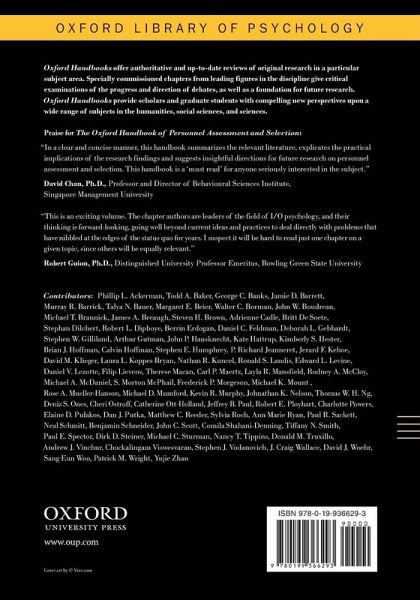 The Oxford Handbook of Personnel Assessment and Selection codifies the wealth of new research surrounding employee selection (web-based assessments, social networking, globalization of organizations), situating them alongside more traditional practices to establish the best and most relevant research for both professionals and academics.