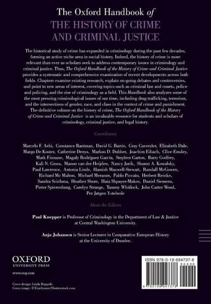 * Introduction * Paul Knepper and Anja Johansen * PART ONE: HISTORIANS, INTERPRETATIONS, METHODOLOGIES * 1. The Historiography of Crime and Criminal Justice - Paul Lawrence * 2. The Crime Historian's Modi Operandi - Barry Godfrey * 3. Long-term Trends in Crime: Continuity and Change - Marcelo F. Aebi and Antonia Linde * 4. Geography of Crime: Urban and Rural Environments - Catherine Denys * PART TWO: FORMS OF CRIME * 5. Histories of Interpersonal Violence in Europe and North America, 1700-Present - Richard Mc Mahon * 6. Ideas and Practices of Prostitution Around the World - Magaly Rodriguez Garcia * 7. Forms of Crime: Crime and Retail Theft - Tammy Whitlock * 8. A Brief History of the Underworld and Organized Crime, c. 1750-1950 - Heather Shore * 9. Terrorism and its Policing: Anarchists and the Era of Propaganda by the Deed, 1870s-1914 - Constance Bantman * 10. Dreams and Nightmares: Drug Trafficking and the History of International Crime - Paul Knepper * PART THREE: CRIME, GENDER, AND ETHNICITIES * 11. Violence and Masculinity - Joachim Eibach * 12. Women and Crime, 1750-2000 - Manon van der Heijden * 13. Policing Minorities - Margo de Koster and Herman Reinke * 14. Black Women, Criminal Justice, and Violence - Kali N. Gross * PART FOUR: CULTURAL REPRESENTATIONS OF CRIME * 15. Crime News and the Press - John Carter Wood * 16. Crime, Criminology, and the Crime Genre - Gray Cavender and Nancy Jurik * 17. Contested Spaces: On Crime Museums, Monuments and Memorials - Per Jørgen Ystehede * 18. A Historical Perspective on Crime Fiction in Mexico During the Middle Decades of the Twentieth Century - Pablo Piccato * PART FIVE: RISE OF CRIMINOLOGY * 19. The Rise of Criminology in its Historical Context - Pieter Spierenburg * 20. Criminal Minds: Psychiatry, Psychopathology, and the Government of Criminality - Stephen Garton * 21. Continuity and Change: Russian and Early Soviet Criminology and the Criminal Woman - Sharon A. Kowalsky * PART SIX: LAW ENFORCEMENT AND POLICING * 22. Policing Before the Police in the Eighteenth Century: British Perspectives in a European Context - David G. Barrie * 23. The Origins of "Modern" Policing - Mark Finnane * 24. Detectives and Forensic Science: The Professionalization of Police Detection - Haia Shpayer-Makov * 25. Police-Public Relations: Interpretations of Policing and Democratic Governance - Anja Johansen * 26. Crime and Policing in Wartime - Clive Emsley * PART SEVEN: LAW, COURTS, AND CRIMINAL JUSTICE * 27. The Role of Popular Justice in U.S. History - Elizabeth Dale * 28. Popular Dramas Between Transgression and Order: Criminal Trials and their Publics in the Nineteenth and Twentieth Centuries in Global Perspective - Daniel Siemens * 29. Mercy and Parole in Anglo-American Criminal Justice Systems from the Eighteenth Century to the Twenty-First Century - Carolyn Strange * 30. Histories of Crime and Criminal Justice and the Historical Analysis of Criminal Law - Markus D. Dubber * PART EIGHT: PUNISHMENT AND PRISONS * 31. The Death Penalty - Randall McGowen * 32. The Rise and Fall of Penal Transportation - Hamish Maxwell-Stewart * 33. The Mad, the Bad and the Pauper: Help and Control in Early Modern Carceral Institutions - Sandra Scicluna * 34. Histories of the Modern Prison: Renewal, Regression, and Expansion - Michael Meranze