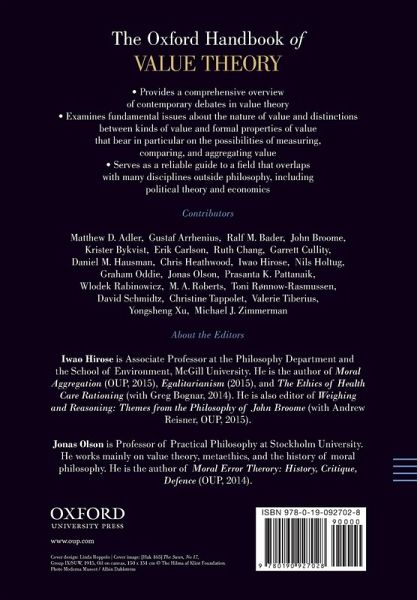 * Contributors * Introduction to Value Theory: Iwao Hirose and Jonas Olson * Part I: Foundations * 1. Value and Normativity: Michael J. Zimmerman * 2. Intrinsic and Extrinsic Value: Toni Rønnow-Rasmussen * 3. Doubts about Intrinsic Value: Jonas Olson * 4. Value and Desires: Graham Oddie * 5. Value and Emotions: Christine Tappolet * 6. Neutral and Relative Value: Garrett Cullity * 7. Value and Time: Krister Bykvist * 8. Monism and Pluralism about Value: Chris Heathwood * 9. Prudential Value: Valerie Tiberius * 10. Kantian Axiology and the Dualism of Practical Reason: Ralf M. Bader * Part II: Structure * 11. Value Incomparability and Incommensurability: Ruth Chang * 12. Value Superiority: Gustaf Arrhenius and Wlodek Rabinowicz * 13. General and Personal Good: Harsanyi's Contribution to the Theory of Value: John Broome * 14. Theories of Value Aggregation: Utilitarianism, Egalitarianism , Prioritarianism: Nils Holtug * 15. Organic Unities: Erik Carlson * 16. Skepticism about Value Aggregation: Iwao Hirose * Part III: Extensions * 17. Value and Cost-Benefit Analysis: Matthew D. Adler * 18. The Value of Health: Daniel Hausman * 19. Freedom and Its Value: Prasanta Pattanaik and Yongsheng Xu * 20. Value in Nature: David Schmidtz * 21. Population Axiology: M. A. Roberts * 22. The Value of Existence: Gustaf Arrhenius and Wlodek Rabinowicz * Index