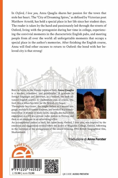 n Oxford, I love you, Anna Quaglia shares her passion for the town that stole her heart. The "City of Dreaming Spires," as defined by Victorian poet Matthew Arnold, has held a special place in her life since her student days. The reader is taken by the hand and passionately led through the streets of Oxford, living with the protagonist during her time in college, experiencing the convivial moments in the characteristic English pubs, and meeting people from all over the world: all unforgettable moments that occupy a special place in the author's memories. After finishing the English course, Anna will find other excuses to return to Oxford: the bond with her beloved city is that strong! Born in Adria, in the Veneto region of Italy, Anna Quaglia is a teacher, translator, and proofreader. A graduate in foreign languages and literature, as a student, she took advanced English courses in Cheltenham and, of course, Oxford: this is when her love for the British city began. Throughout her career, she taught Italian as a second language, mainly to Erasmus students, and worked in a translation office. A woman of many facets, Quaglia also had a brief experience as a DJ at a private radio station in Ferrara and then as an employee in an advertising office. An accomplished author as well, her latest book, Oxford, I love you, was inspired by the emotions and suggestions evoked when she stayed at Magdalen College, Oxford, following in the footsteps of the protagonists of the award-winning 1993 British biographical film, Shadowlands.