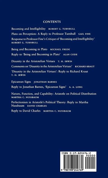This special supplementary volume contains the proceedings of the Colloquium on Ancient Philosophy held at Oberlin College in 1986. The contributors--including Michael Frede, Jonathan Barnes, Martha C. Nussbaum, Robert G. Turnbull, Gail Fine, Alan Code, T.H. Irwin, A.A. Long, and David Charles--address being, becoming, and intelligibility in Plato; disunity in the Aristotelian virtues; Epicurean signs; and Aristotle on political distribution.