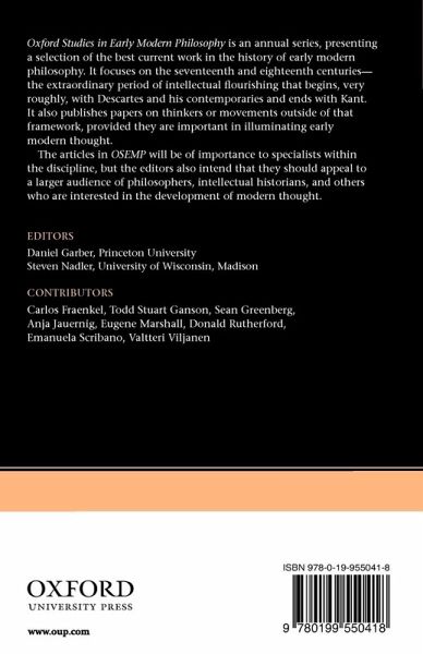 Oxford Studies in Early Modern Philosophy is an annual series, presenting a selection of the best current work in the history of early modern philosophy. It focuses on the seventeenth and eighteenth centuries--the extraordinary period of intellectual flourishing that begins, very roughly, with Descartes and his contemporaries and ends with Kant. It also publishes papers on thinkers or movements outside of that framework, provided they are important in illuminating early modern thought. The articles in OSEMP will be of importance to specialists within the discipline, but the editors also intend that they should appeal to a larger audience of philosophers, intellectual historians, and others who are interested in the development of modern thought.
