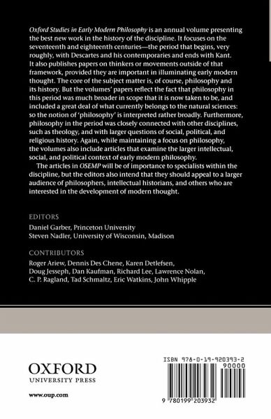 Oxford Studies in Early Modern Philosophy focuses on the seventeenth and eighteenth centuries - the extraordinary period of intellectual flourishing that begins, very roughly, with Descartes and his contemporaries and ends with Kant. It also publishes papers on thinkers or movements outside of that framework, provided they are important in illuminating early modern thought.