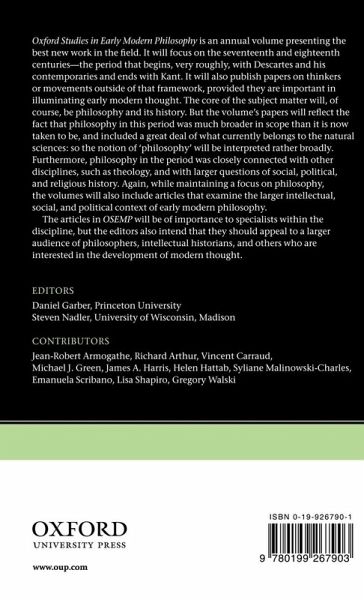 Oxford University Press is proud to announce an annual volume presenting a selection of the best new work in the history of philosophy. Oxford Studies in Early Modern Philosophy will focus on the seventeenth and eighteenth centuries - the extraordinary period of intellectual flourishing that begins, very roughly, with Descartes and his contemporaries and ends with Kant. It will also publish papers on thinkers or movements outside of that framework, provided they are important in illuminating early modern thought. The articles in OSEMP will be of importance to specialists within the discipline, but the editors also intend that they should appeal to a larger audience of philosophers, intellectual historians, and others who are interested in the development of modern thought.