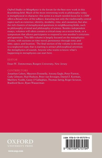Oxford Studies in Metaphysics is the forum for the best new work in this flourishing field. Much of the most interesting work in philosophy today is metaphysical in character: this series is a much-needed focus for it. OSM offers a broad view of the subject, featuring not only the traditionally central topics such as existence, identity, modality, time, and causation, but also the rich clusters of metaphysical questions in neighbouring fields, such as philosophy of mind and philosophy of science. Besides independent essays, volumes will often contain a critical essay on a recent book, or a symposium that allows participants to respond to one another's criticisms and questions. This fifth volume is largely focused on the metaphysics of time, with sections on time travel; persistence through time; and time, space, and location. The final section of the volume is devoted to a neglected topic that is starting to attract philosophical attention: the metaphysics of sounds. Anyone who wants to know what's happening in metaphysics can start here.