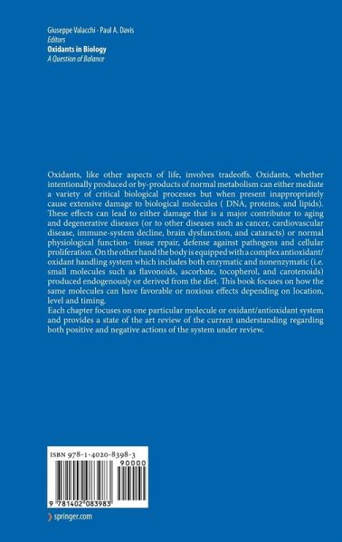 Oxidants, like other aspects of life, involves tradeoffs. Oxidants, whether intentionally produced or by-products of normal metabolism can either mediate a variety of critical biological processes but when present inappropriately cause extensive damage to biological molecules (DNA, proteins, and lipids). These effects can lead to either damage that is a major contributor to aging and degenerative diseases (or to other diseases such as cancer, cardiovascular disease, immune-system decline, brain dysfunction, and cataracts) or normal physiological function- tissue repair, defense against pathogens and cellular proliferation. On the other hand the body is equipped with a complex antioxidant/oxidant handling system which includes both enzymatic and nonenzymatic (i.e. small molecules such as flavonoids, ascorbate, tocopherol, and carotenoids) produced endogenously or derived from the diet. This book focuses on how the same molecules can have favorable or noxious effects depending on location, level and timing.