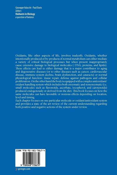 Oxidants, like other aspects of life, involves tradeoffs. Oxidants, whether intentionally produced or by-products of normal metabolism can either mediate a variety of critical biological processes but when present inappropriately cause extensive damage to biological molecules (DNA, proteins, and lipids). These effects can lead to either damage that is a major contributor to aging and degenerative diseases (or to other diseases such as cancer, cardiovascular disease, immune-system decline, brain dysfunction, and cataracts) or normal physiological function- tissue repair, defense against pathogens and cellular proliferation. On the other hand the body is equipped with a complex antioxidant/oxidant handling system which includes both enzymatic and nonenzymatic (i.e. small molecules such as flavonoids, ascorbate, tocopherol, and carotenoids) produced endogenously or derived from the diet. This book focuses on how the same molecules can have favorable or noxious effects depending on location, level and timing.