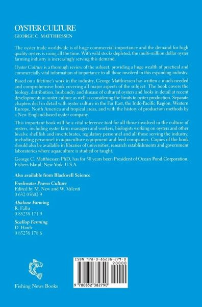 The oyster trade worldwide is of huge commercial importance, and the demand for high quality oysters is rising all the time. With wild stocks depleted, the ever-increasing multi-million dollar oyster farming industry is serving this demand. Oyster Culture is a thorough review of the subject, providing a huge wealth of practical and commercially vital information of importance to all those involved in this expanding industry. Based on a lifetime's work in the industry, George Matthiessen has written a much-needed and comprehensive book covering all major aspects of the subject. The book covers the biology, distribution, husbandry and disease of cultured oysters and looks in detail at recent developments in oyster culture as well as considering the limits to oyster production. Separate chapters deal in detail with a) oyster culture in the Far East, the Indo-Pacific Region, Western Europe, North America and tropical areas and b) a history of production methods by a New England-based oyster company. This important book will be a vital tool and reference work for all those involved in the culture of oysters, including oyster farm managers and workers; biologists working on oysters and other bivalve shellfish and invertebrates; regulatory personnel and all those serving the industry, including personnel in aquaculture equipment and feed companies. Copies of the book should also be available in libraries of universities, research establishments and government laboratories where aquaculture is studied or taught. George C. Matthiessen PhD, has for 30 years been President of Ocean Pond Corporation, Fishers Island, New York, U.S.A.