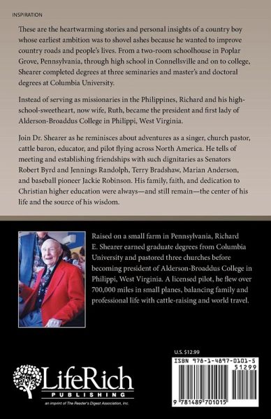 These are the heartwarming stories and personal insights of a country boy whose earliest ambition was to shovel ashes because he wanted to improve country roads and people's lives. From a two-room schoolhouse in Poplar Grove, Pennsylvania, through high school in Connellsville and on to college, Shearer completed degrees at three seminaries and master's and doctoral degrees at Columbia University. Instead of serving as missionaries in the Philippines, Richard and his high-school-sweetheart, now wife, Ruth, became the president and first lady of Alderson-Broaddus College in Philippi, West Virginia. Join Dr. Shearer as he reminisces about adventures as a singer, church pastor, cattle baron, educator, and pilot flying across North America. He tells of meeting and establishing friendships with such dignitaries as Senators Robert Byrd and Jennings Randolph, Terry Bradshaw, Marian Anderson, and baseball pioneer Jackie Robinson. His family, faith, and dedication to Christian higher education were always-and still remain-the center of his life and the source of his wisdom.