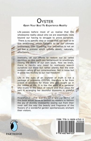 OYSTER Open Your Soul To Experience Reality Life passes before most of us realise that the wholesome reality about who we are essentially rests beyond our having to struggle to prove ourselves. There is no specific step or action that can lead us to this awakening which happens to be our ultimate entitlement. Like flowering this realisation is not an act but a process which unfolds slowly, naturally, effortlessly ... Ironically, all our efforts to restore our so called identities on this earth are tantamount to unwittingly closing the doors of our own souls. How we knew, there is hardly any need to restlessly search ourselves out there but rather silently feel the ever existent calling of our consciousness. Not in noise but in poise lies the key to our real freedom! Life in the eyes of an explorer of truth is not a package of problems. OYSTER, therefore is far from a book of solutions for those who are caught up in the riddles of life. It is like the work of a gardener who trusts in the ways of nature and thus plays his part in arranging her bountiful blossoms in grateful joy. Hopefully, the words and paragraphs of this book would serve to beckon its readers to fathom the joy of divinity incessantly oozing out from their inner self the way the beauty and fragrance of the flowers of a wonderful garden spontaneously enchant their visitors.