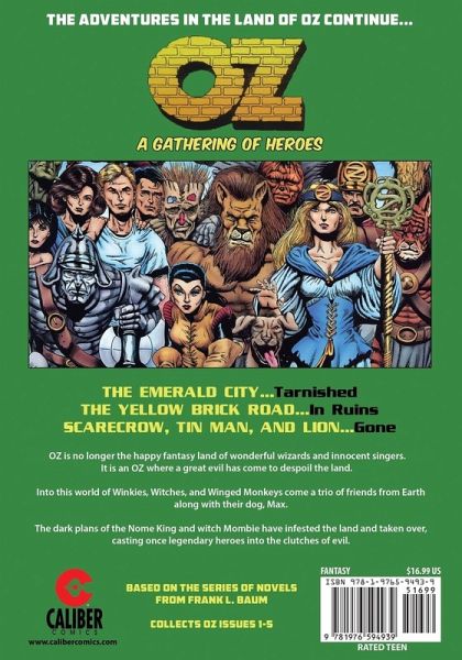 Based on the series of novels from Frank L. Baum. Return to and witness the incredible land of OZ after Dorothy and Toto had their famous adventure. But now… The Emerald City is tarnished. The Yellow Brick Road is in ruins. Scarecrow, Tin Man, and Lion, are gone. OZ is no longer a happy fantasy land of wonderful wizards and innocent singers. It is an OZ where a great evil has darkened the skies and come to despoil the land. And into this world of Winkies, Witches, and Winged Monkeys come a trio of friends from Earth along with their dog Max. The dark plans of the Nome King and the witch Mombie have infested the land and taken over, casting once legendary heroes into the clutches of evil. It is now up to these three earthlings and a ragtag group of OZ Freedom Fighters to once again restore OZ to its rightful and peaceful glory. Collects issues 1-5 of the critically acclaimed OZ comic book series.