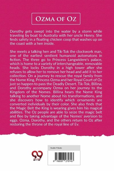 Dorothy gets swept into the water by a storm while traveling by boat to Australia with her uncle Henry. She finds safety in a floating chicken coop that washes up on the coast with a hen inside. She meets a talking hen and Tik-Tok the clockwork man, one of the earliest sentient humanoid automatons in fiction. The three go to Princess Langwidere's palace, which is home to a variety of interchangeable, removable heads. She locks Dorothy in a high tower after she refuses to allow her to remove her head and add it to her collection. On a journey to rescue the royal family from the Nome King,…mehr