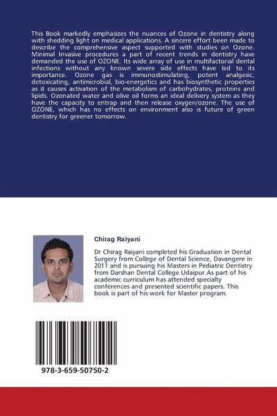 This Book markedly emphasizes the nuances of Ozone in dentistry along with shedding light on medical applications. A sincere effort been made to describe the comprehensive aspect supported with studies on Ozone. Minimal Invasive procedures a part of recent trends in dentistry have demanded the use of OZONE. Its wide array of use in multifactorial dental infections without any known severe side effects have led to its importance. Ozone gas is immunostimulating, potent analgesic, detoxicating, antimicrobial, bio-energetics and has biosynthetic properties as it causes activation of the metabolism of carbohydrates, proteins and lipids. Ozonated water and olive oil forms an ideal delivery system as they have the capacity to entrap and then release oxygen/ozone. The use of OZONE, which has no effects on environment also is future of green dentistry for greener tomorrow.