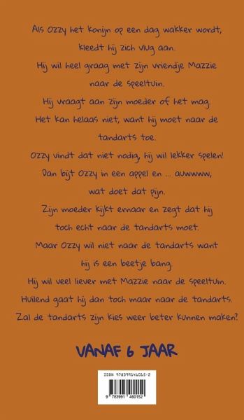 Ozzy het konijn heeft een zieke kies. Hij moet naar de tandarts, maar hij durft niet. Kan de tandarts zijn kies weer beter maken? Een lief prentenboek over moed, vertrouwen en vriendschap.