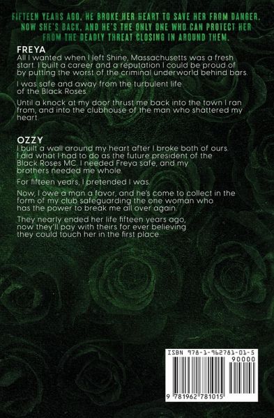Fifteen years ago, he broke her heart to save her from danger. Now she's back, and he's the only one who can protect her from the deadly threat closing in around them. Freya All I wanted when I left Shine, Massachusetts was a fresh start. I built a career and a reputation I could be proud of by putting the worst of the criminal underworld behind bars. I was safe and away from the turbulent life of the Black Roses. Until a knock at my door thrust me back into the town I ran from, and into the clubhouse of the man who shattered my heart. Ozzy I built a wall around my heart after I broke both of ours. I did what I had to do as the future president of the Black Roses MC. I needed Freya safe, and my brothers needed me whole. For fifteen years, I pretended I was. Now, I owe a man a favor, and he's come to collect in the form of my club safeguarding the one woman who has the power to break me all over again. They nearly ended her life fifteen years ago, now they'll pay with theirs for ever believing they could touch her in the first place.