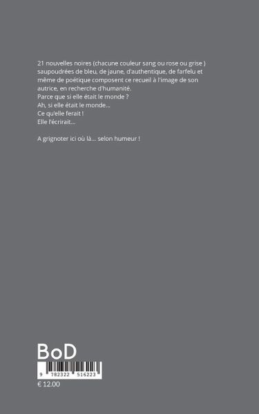 21 nouvelles noires (chacune couleur sang ou rose ou grise ) saupoudrées de bleu, de jaune, d'authentique, de farfelu et même de poétique composent ce recueil à l'image de son autrice, en recherche d'humanité. Parce que si elle était le monde ? Ah, si elle était le monde... Ce qu'elle ferait ! Elle l'écrirait... A grignoter ici où là... selon humeur !