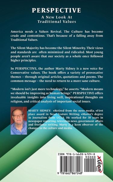 America needs a Values Revival. The Culture has become crude and contentious. That's because of a falling away from Traditional Values. The Silent Majority has become the Silent Minority. Their views and standards are often minimized and ridiculed. Most young people aren't aware that our society as a whole once followed higher principles. In PERSPECTIVE, the author Marty Sidney is a new voice for Conservative values. The book offers a variety of provocative themes - through original articles, quotations and poems. The common message - the need to return to a more sane culture. "Modern isn't just more technology," he asserts. "Modern means we should be improving as human beings." PERSPECTIVE offers invaluable insights into living well, inspirational thoughts on religion, and critical analysis of important social issues. MARTY SIDNEY: +Retired from the news media. +First place award in News Feature Writing. +Master's degree in Journalism from UCLA. He worked for 30 years in newspaper reporting, television news, government affairs and freelance writing. Marty is a keen observer of the changes in the culture and media.