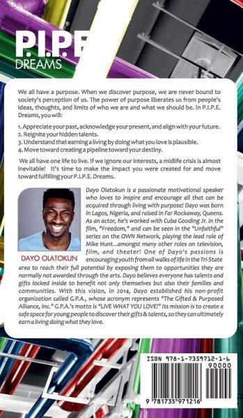 We all have a purpose. When we discover purpose, we are never bound to society's perception of us. The power of purpose liberates us from people's ideas, thoughts, and limits of who we are and what we should be. In P.I.P.E. Dreams, you will: 1. Appreciate your past, acknowledge your present, and align with your future. 2. Reignite your hidden talents. 3. Understand that earning a living by doing what you love is plausible. 4. Move toward creating a pipeline toward your destiny. We all have one life to live. If we ignore our interests, a midlife crisis is almost inevitable! It's time to make the impact you were created for and move toward fulfilling your P.I.P.E. Dreams.