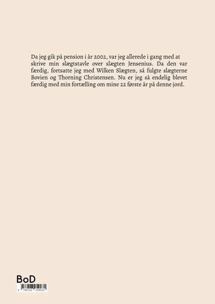 Da jeg gik på pension i år 2002, var jeg allerede i gang med at skrive min slægtstavle over slægten Jensenius. Da den var færdig, fortsatte jeg med Wilken Slægten, så fulgte slægterne Bovien og Thorning Christensen. Nu er jeg så endelig blevet færdig med min fortælling om mine 22 første år på denne jord.